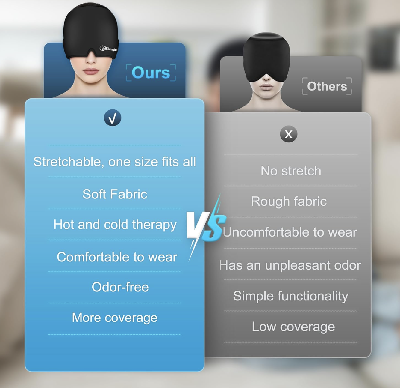 The BEYIO Migraine Relief Cap has been a lifesaver for my chronic migraines. I keep the black one in the freezer and slip it on at the first sign of pain – the all-around gel coverage cools my forehead, temples, and eyes perfectly. Within 15-20 minutes the throbbing usually drops significantly. It's reusable, stays cold long enough, and doesn't leak. No more relying only on meds. Highly recommend for anyone who suffers headaches regularly.